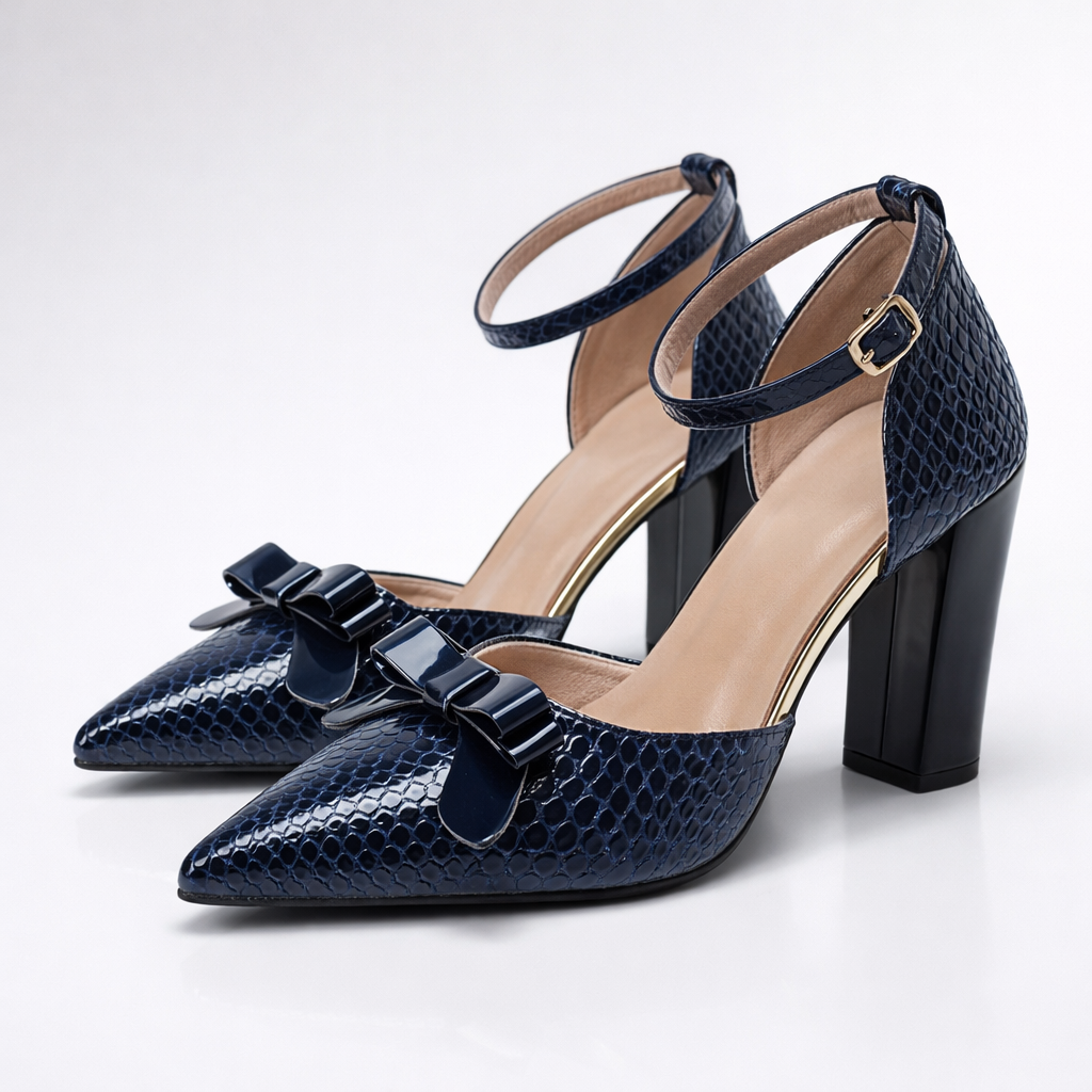 Designed for confident, modern dressing, these pointed-toe block heels combine a polished silhouette with everyday wearability. The glossy croc-embossed finish adds refined texture, while the stable heel and secure ankle strap support comfortable movement from day to night. Finished with a subtle bow detail, the silhouette stays clean, balanced, and intentional.